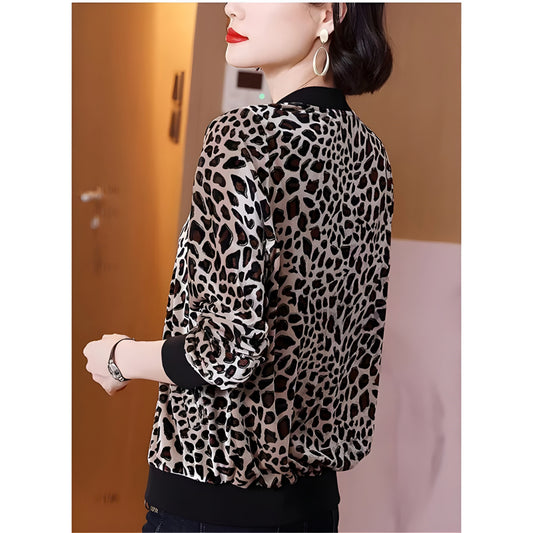 Stylish Leopard-Printed Velvet Zipper Bomber Jacket